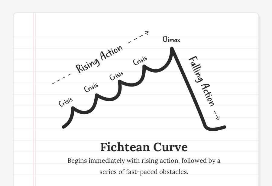 Második ábra az úgy nevezett Fichtean Curve, aminek a lényege, hogy a szerző in medias res kezd (belecsap a cselekménybe), a történetet kis szakaszonként képzeli el, és mindegyik végén ott egy krízis. De ez annyiban nem epizodikus történetvezetés, hogy ez a szerkezet is emeli a téteket, és egy tetőpont felé építkezik, majd lezárja a cselekményt. Ezt a logikát látjuk regénysorozatoknál, átívelőszálas tv sorozatoknál: az egyes részekben van egy kisebb krízis, ami el kell hárítani, de az egész egy nagyobb krízisben kulminálódik. Ezt persze meg lehet csinálni egy köteten belül is.