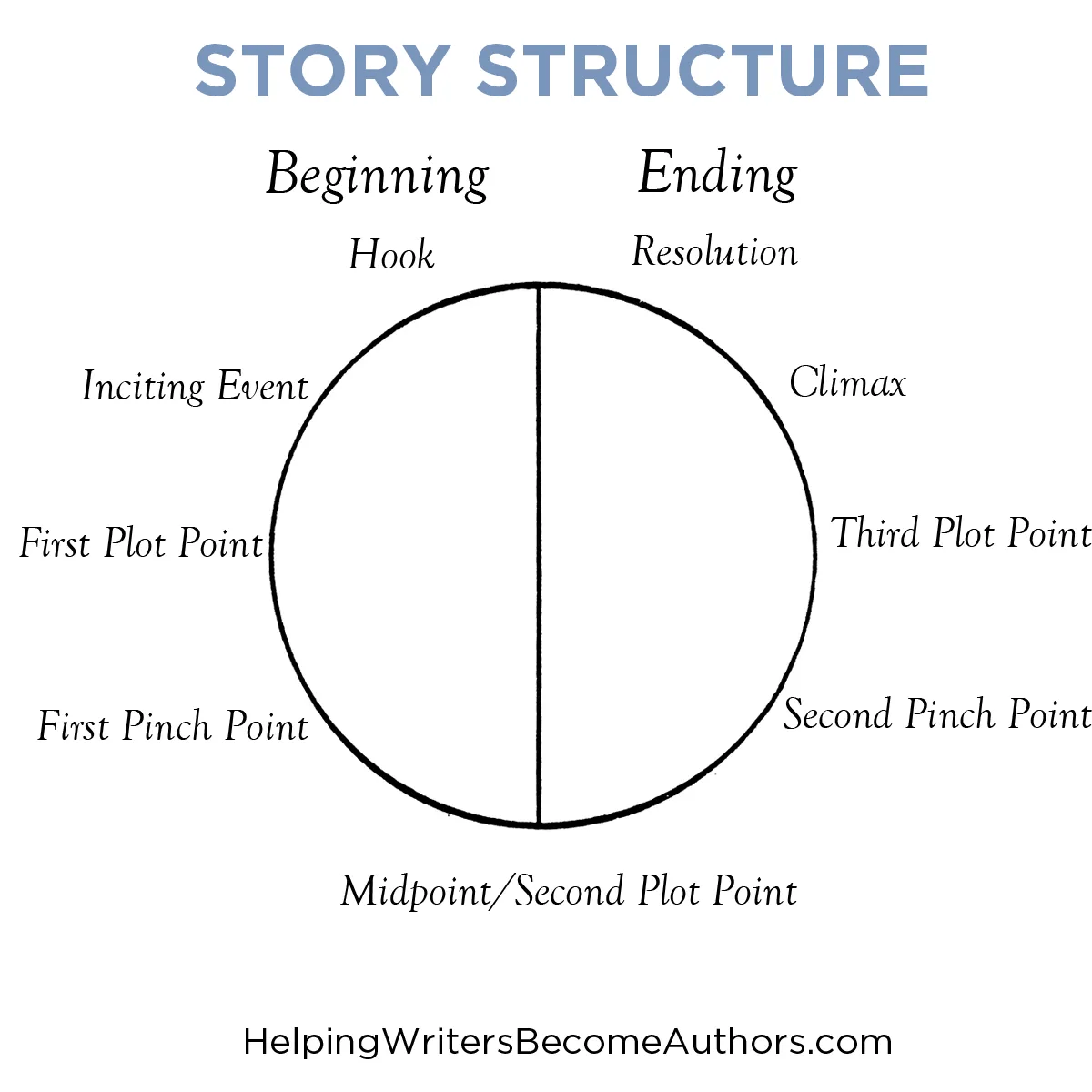 Harmadik ábra K. M. Weiland ábrája (Helping Writers Become Authors). Tulajdonképpen ez a tipikus háromfelvonásos szerkezet, csak körön. (Ez pinch pointokat is használ, amik tulajdonképpen további akadályok, és kiélezik a konfliktust.)