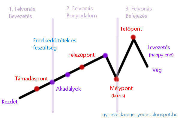 A fenti ábrák közül bármelyiket használhatod, amelyik csak szimpatikus. Nyugodtan próbálj ki többfélét, de ami miatt az íróknak a legegyszerűbb alapszerkezetet tanítom, mert ez a legkevésbé komplikált, ezt bárki tudja használni bármilyen történethez, és aki ezt megérti, az összes többit is alkalmazni tudja.